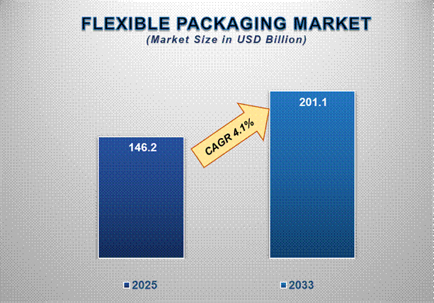 According to market estimates, the global flexible packaging market is projected to grow from USD 146.2 billion in 2025 to approximately USD 201.1 billion by 2033, at a CAGR of 4.1%. This steady growth reflects consumer lifestyle changes, rising e-commerce penetration, and regulatory pushes for sustainable packaging.